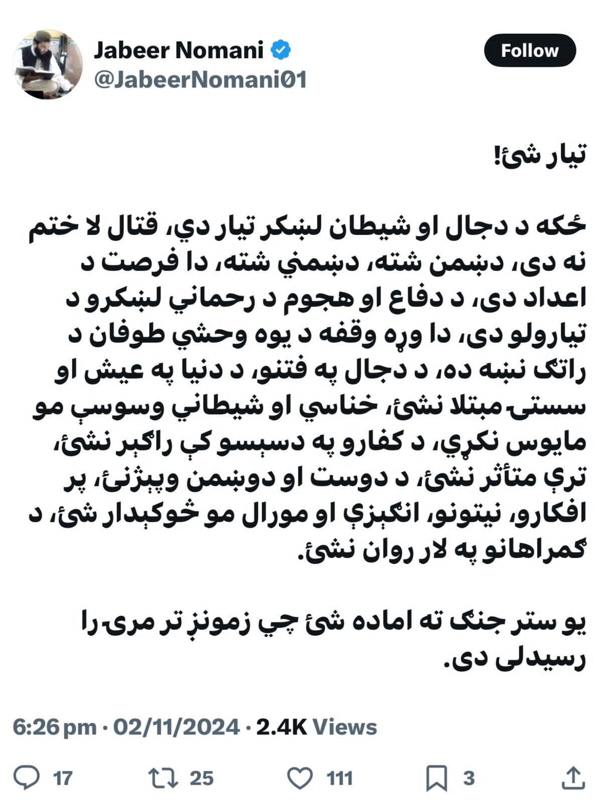 جابر نعماني طالبانو ته:هغه جنګ ته اماده شئ چې زمونږ تر مرۍ رارسېدلی، نسبي ارامي د یو وحشي طوفان د راتګ ښکارندوی ده