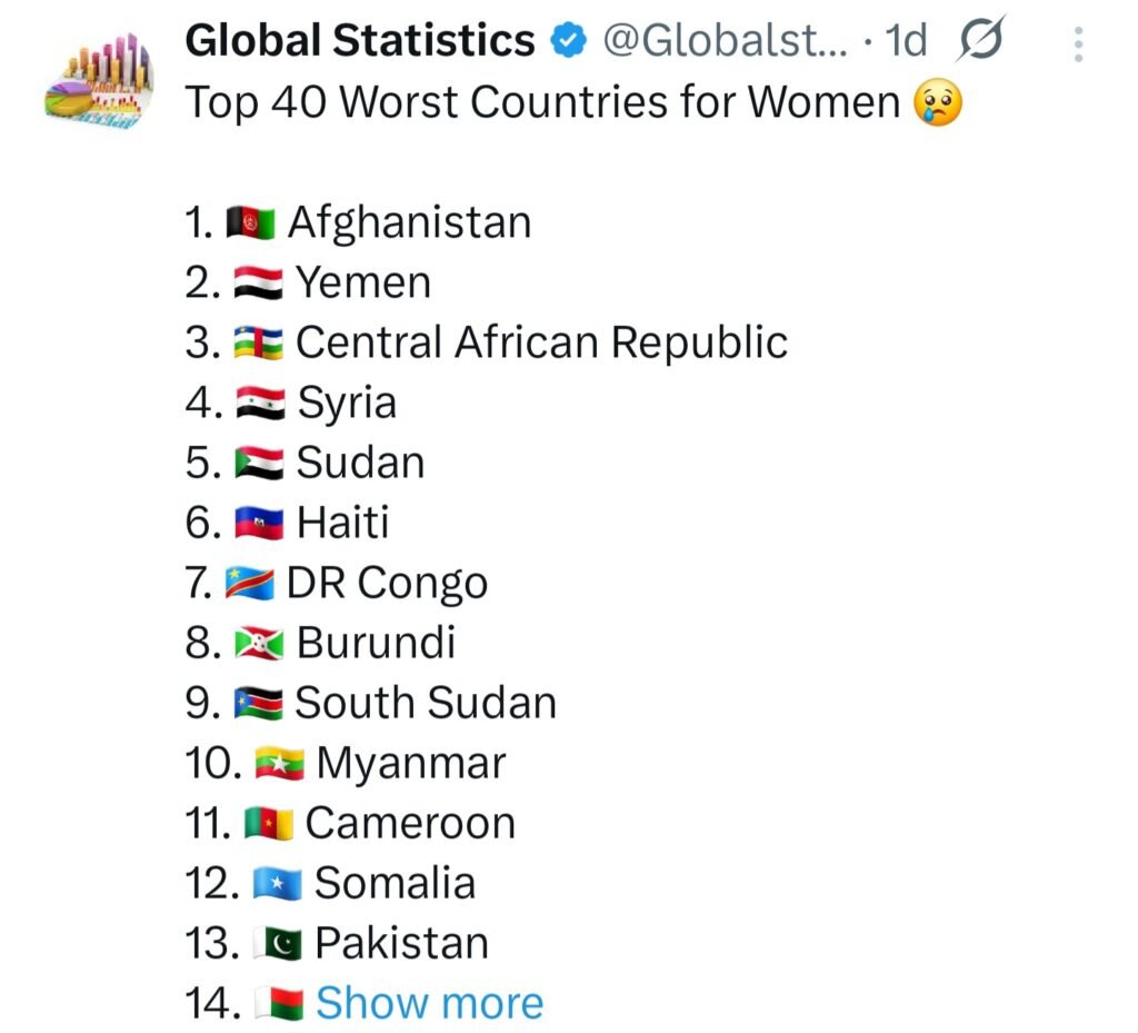د راپور له مخې د ښځو لپاره د تر ټولو بدو هیوادونو په لومړي سر کې د افغانستان بیا یمن، د مرکزي افریقا جمهوریت، سوریه، سوډان، هایټي، د کانګو دیموکراتیک جمهوریت، برونډي، جنوبي سوډان او میانمار نومونه شامل دي.