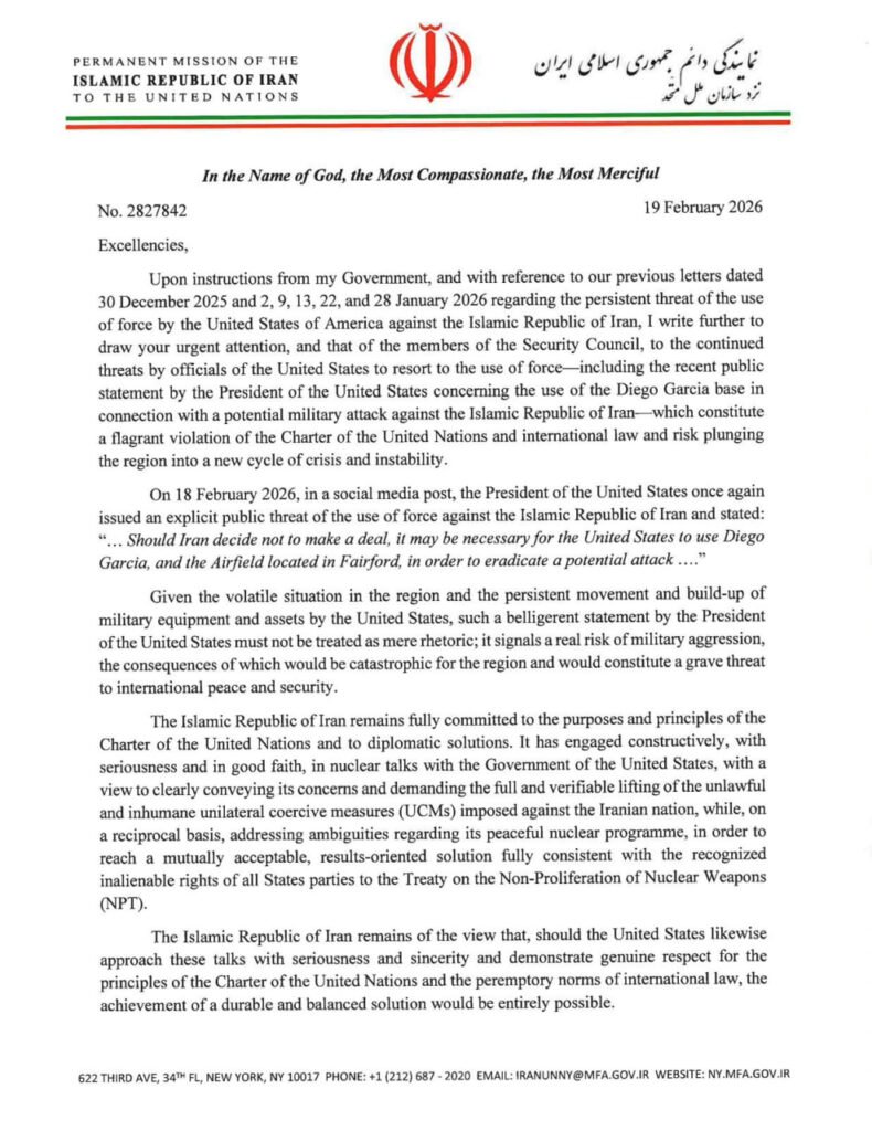 ایران په یوه رسمي لیک کې ملګرو ملتونو ته خبرداری ورکړی چې که پر دغه هېواد هر ډول برید وشي، تهران به په سیمه کې د دښمن پوځي اډې د مشروع هدفونو په توګه په نښه کړي.