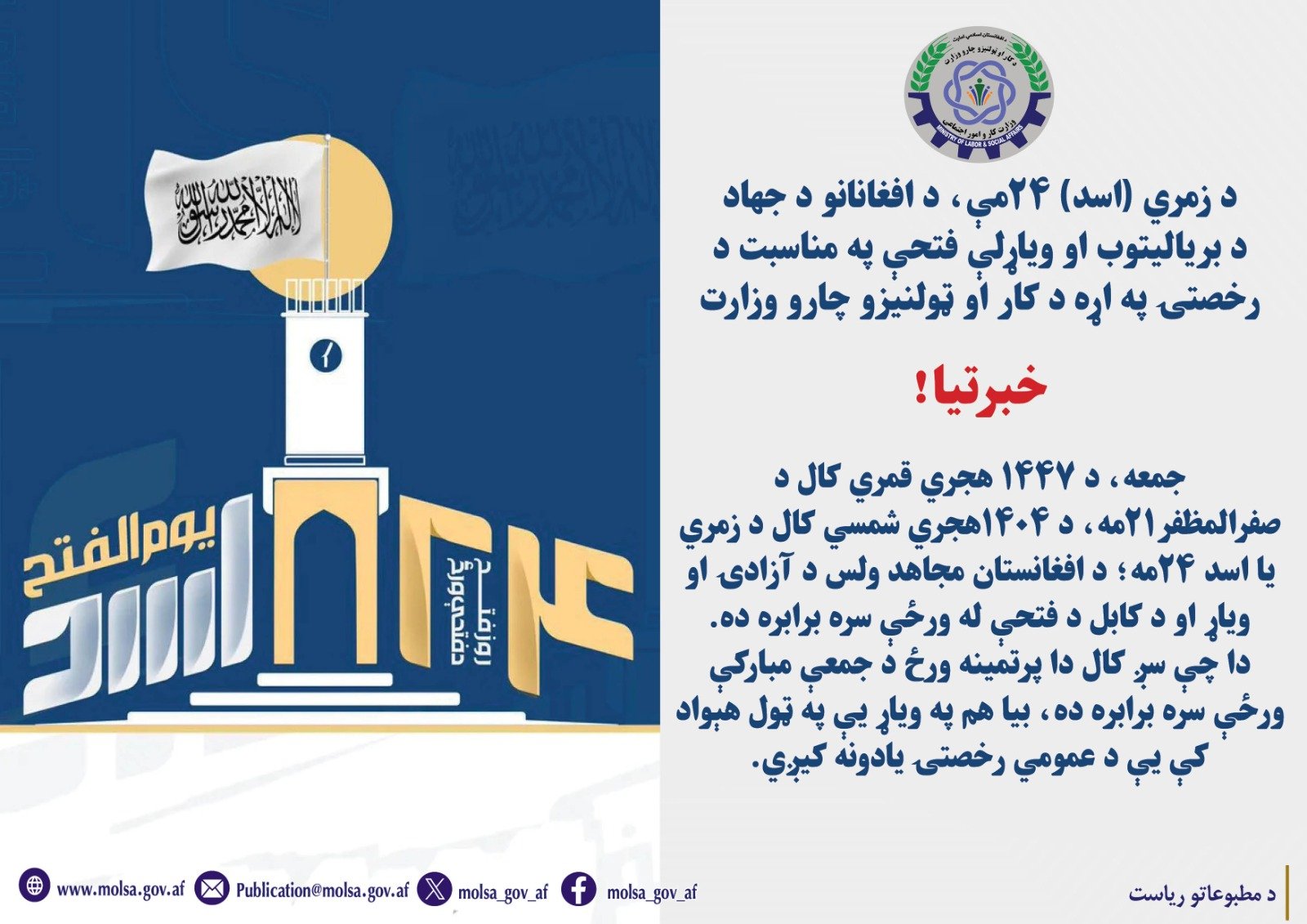 له یاد وزارت څخه خپره شوې خبرپاڼه کې راغلي، چې که څه هم دا ورځ رخصت دی؛ خو دوی یې بیا هم ځکه عمومي رخصتي اعلانوي، چې د اسد له ۲۴مې سره برابره ده.