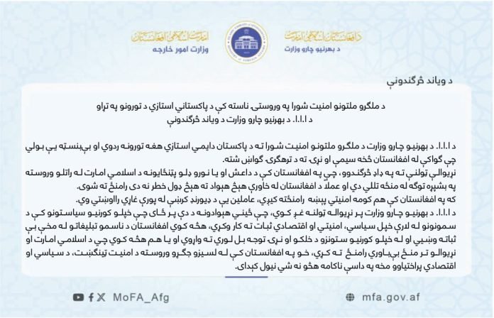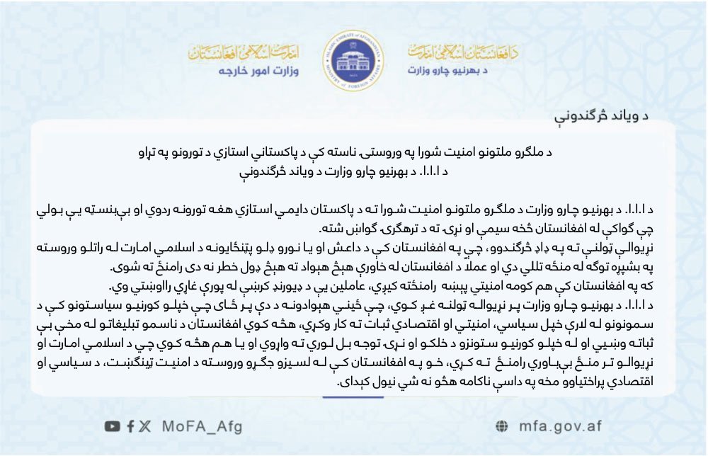 د طالبانو حکومت د بهرنیو چارو وزارت یوه اعلامیه کې ویلي، چې د دوی له واکمنېدو وروسته ټولې ترهګرې ډلې ختمې شوې او که افغانستان کې کومه امنیتي پېښه شوې وي؛ نو له پولې پورې غاړې څخه سرچینه اخلي.