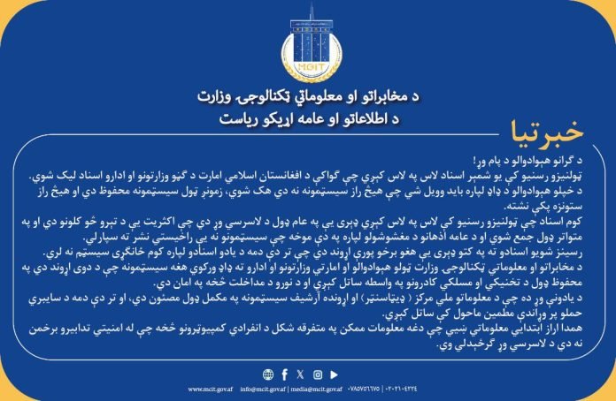 د طالبانو حکومت د مخابراتو وزارت تایید کړه چې د دوی د حکومت د ځینو ادارو ویبسایټونه هک او افشا شوي دي.
