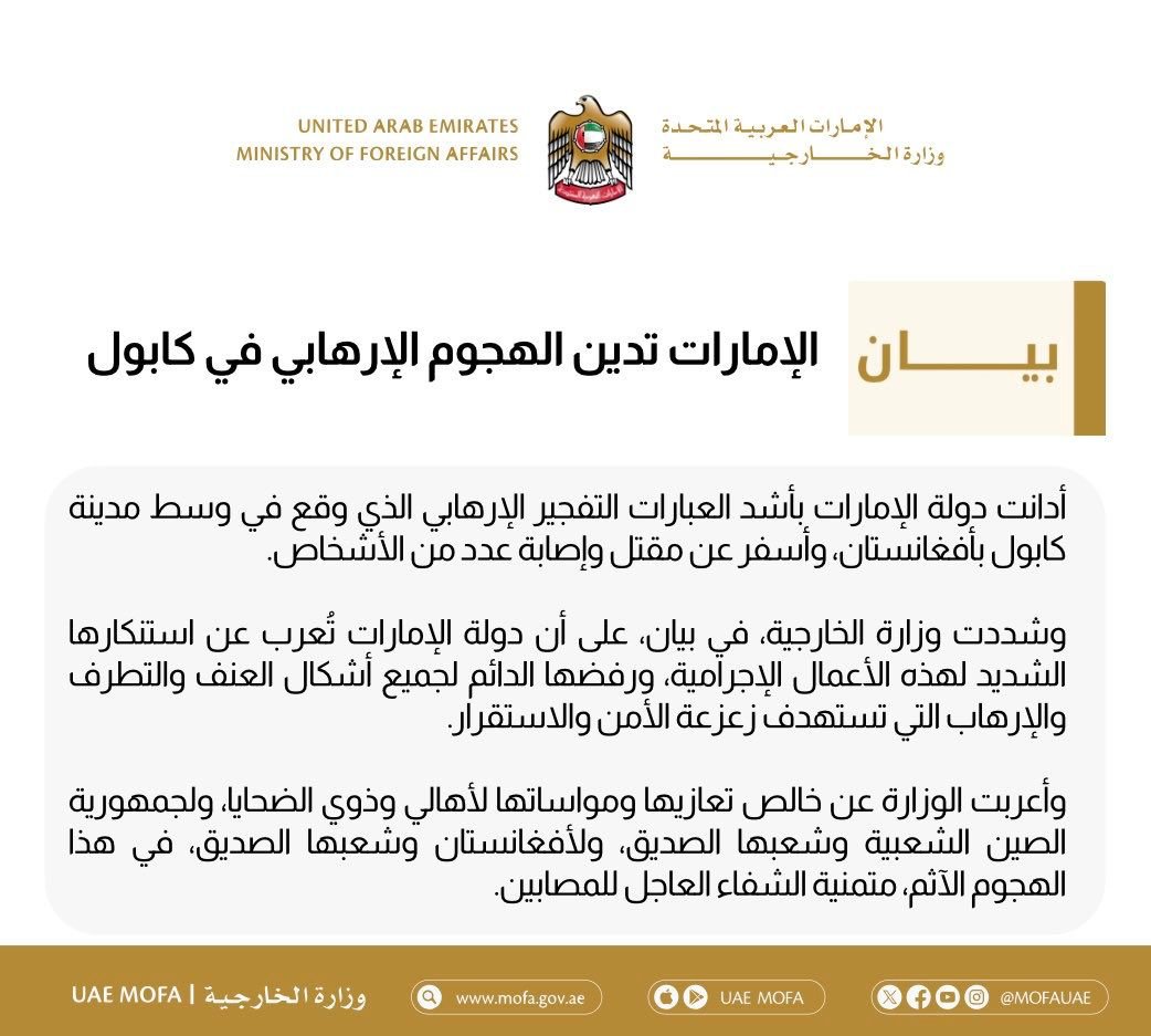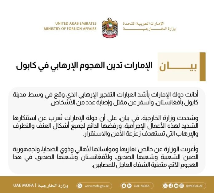 د متحده عربي اماراتو دولت په کابل کې د تېرې ورځې برید غندلی او دا پېښه یې ترهګریز عمل بللی.