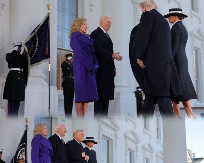 د امریکا نوي ولسمشر ډونالډ ټرمپ د لوړې له مراسمو وړاندې له خپلې مېرمنې سره یوځای له ولسمشر جوبایډن او د هغه مېرمن سره کتلي.